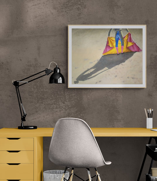 telles que le jaune safran et le rose fuchsia, contraste magnifiquement avec le bleu du costume sous la lumière éclatante du soleil. Cependant, c'est l'ombre étrangement étirée du torero qui