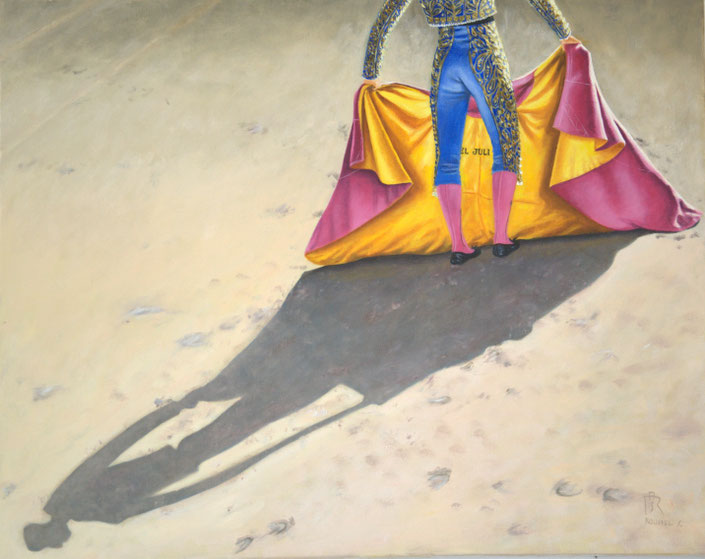 projetée sur le sable, au centre de la composition, on peut distinguer la silhouette de dos d'El Juli, le célèbre torero, vêtu de son costume bleu. La cape déployée, dans des couleurs vives